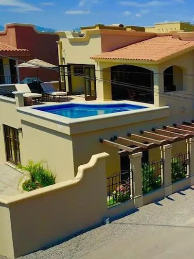 This home comes with two master suites, including a king bed in each, and each complete with full private restrooms. It also has a family suite, including a full private bathroom, one king bed, and two twin beds. It has a full kitchen, including pots, pans, dishes, and silverware. It has a pool and a beautiful view of the Sea of Cortes.